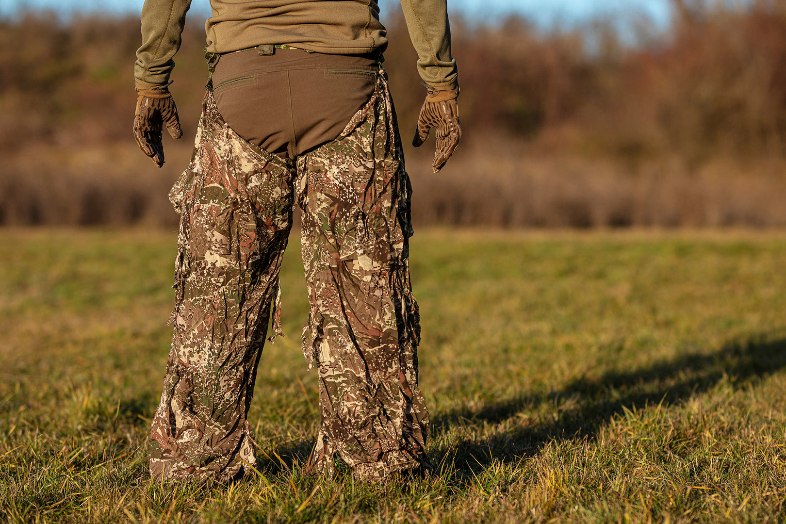 - Without opening or dropping the camouflage – access to leg pocket, bags