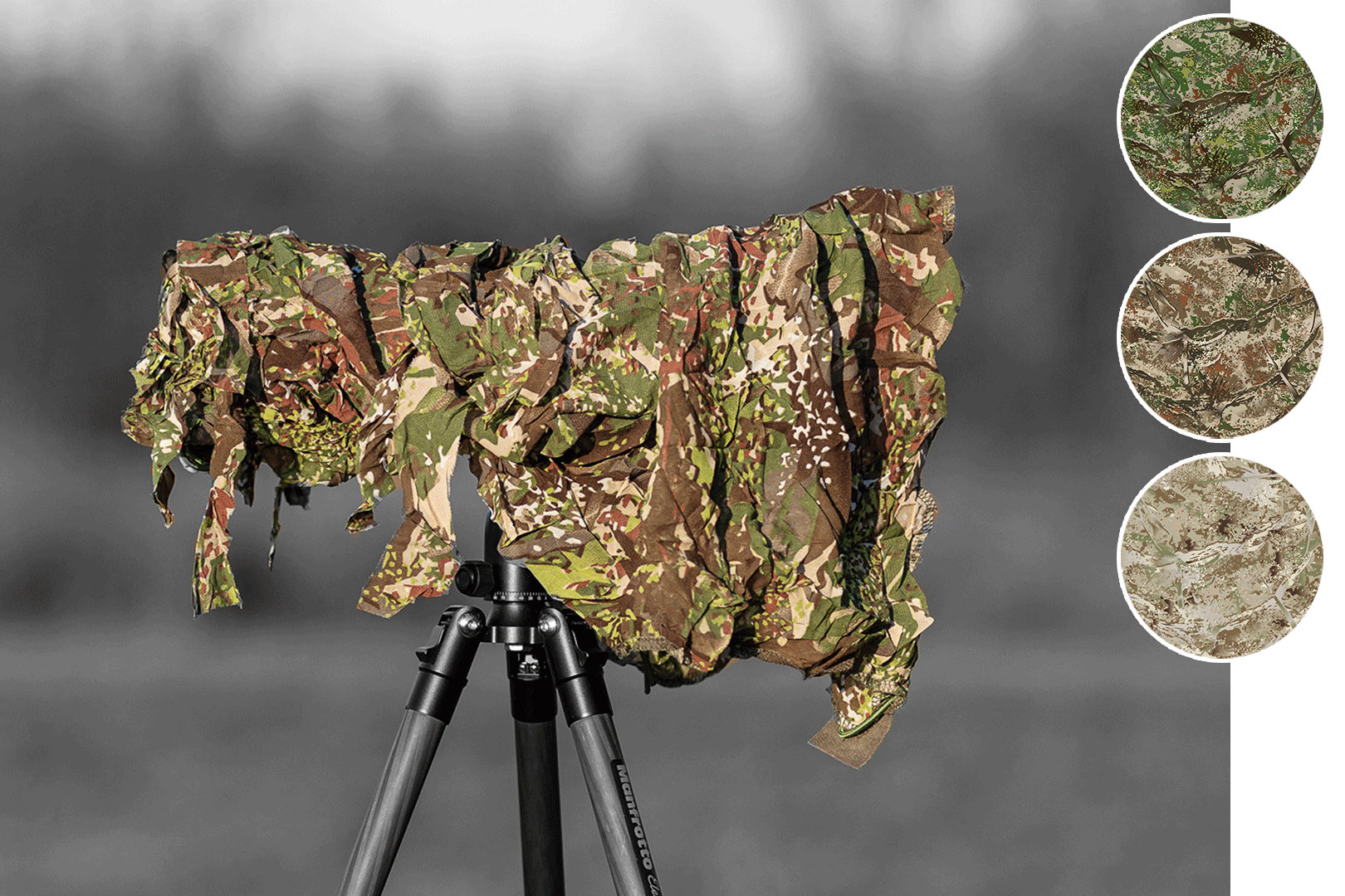 The Optic-Camo can be used to cover camera lenses and spotting scopes. The silent material sits loose and allows full operability of buttons on the lens and camera. Depending on the length of the lens, the camera will also be covered. On the camera the Optic-Camo sits loose, when it is long enough. So it can even cover the hands. Two elastic cords and silicone offers a secure fit on the lens or spotting scope.
